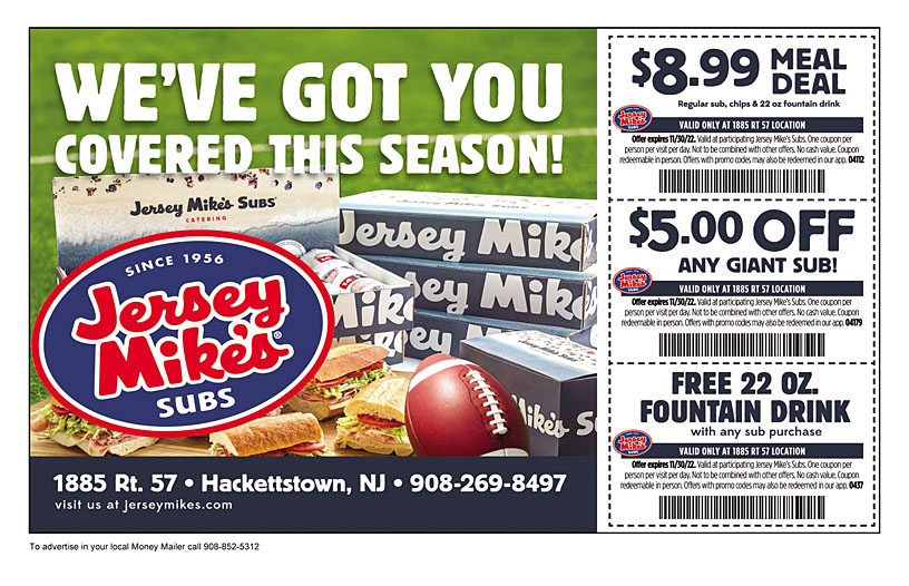 Jersey Mike's Subs - MyMike's™ To earn points, simply visit any participating Jersey Mike’s location and make any qualifying purchase. You'll receive: 3 points for every KID'S MEAL 4 points for every MINI size sub or Breakfast Sandwich (where available) 6 points for every REGULAR, Wrap or Sub Bowl 12 points for every GIANT that you purchase. Jersey Mike's Coupon, Promo Codes: $2 Off - November 2022 Tip: If your Jersey Mike’s printable coupons have a 4-6 digit code at the bottom, that is a signal your Jersey Mike’s coupon is only valid for in-store purchases. Online Jersey Mike’s promo codes are alpha-numeric. Jersey Mike's Printable Coupons Black Friday 2022 - 30% OFF Free & Latest Black Friday Jersey Mike's Printable Coupons. Use Promo Codes at jerseymikes.com. Save around $21.27 from Jersey Mike's. Redeem it & Get extra 30% OFF discount.